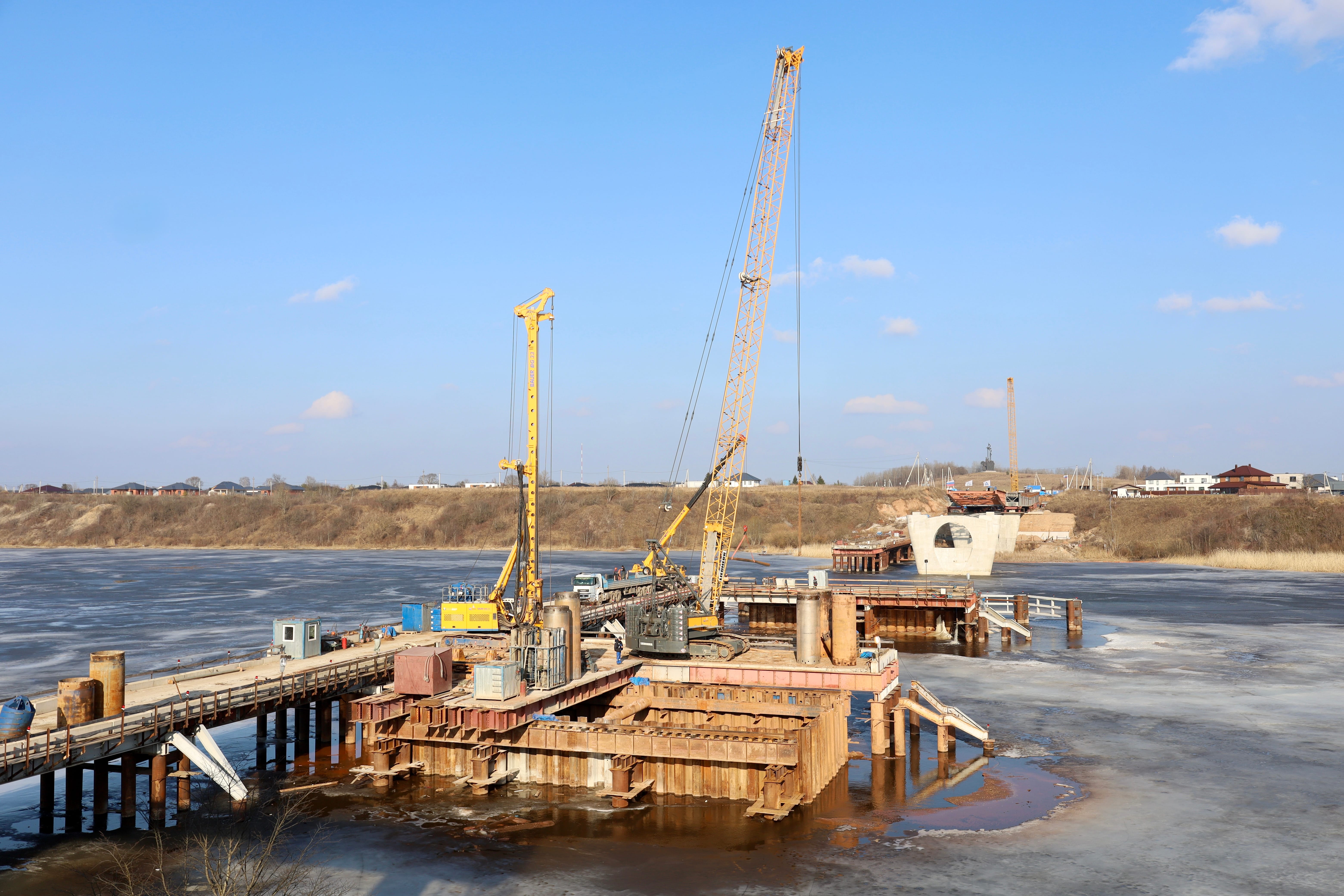 Параллельно на берегу со стороны деревни Хотицы идет сборка металлического пролетного строения, которое надвигается гидравлическими домкратами на опоры в русле реки. Уже готово 150 пог. м пролетного строения. Современная технология надвижки сокращает сроки монтажа примерно на 40 % по сравнению с другими методами и повышает точность установки. Полностью завершить этот этап планируется до конца года.