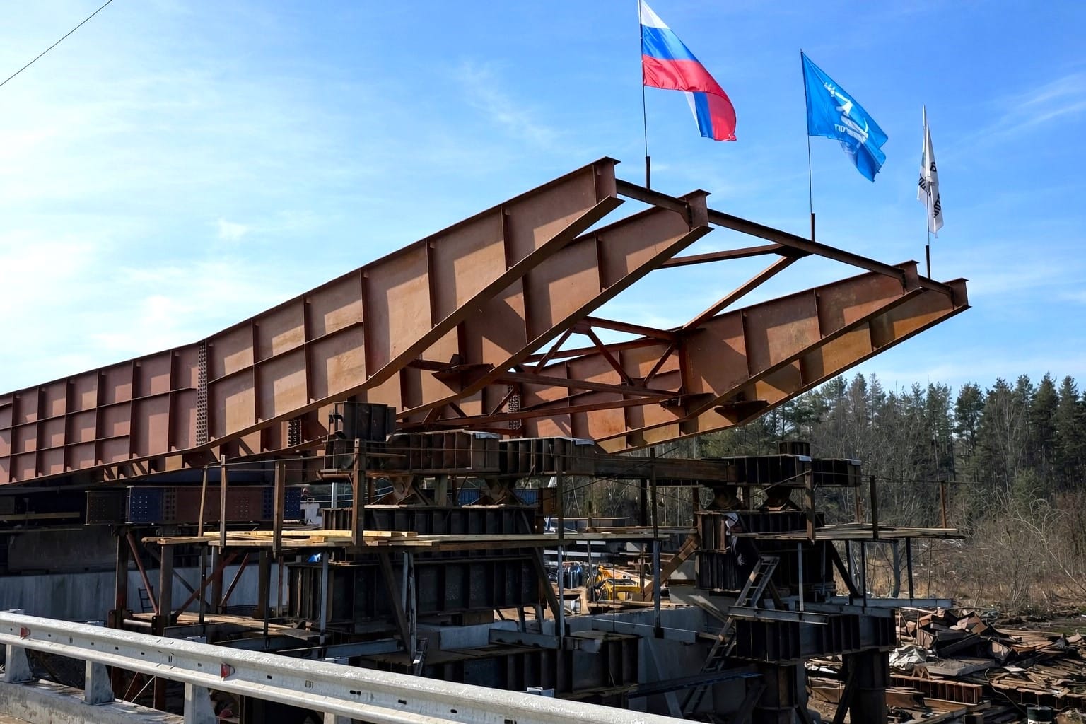 Сборка пролетных конструкций осуществляется на стапеле, после чего с применением домкратов они последовательно перемещаются по накаточным путям на опоры, занимая проектное положение. Завершить надвижку планируется уже в июне текущего года.